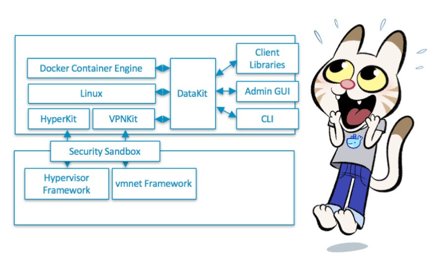 Docker for Mac 也是在本地跑了一个虚拟机来运行 Docker,不过 Hypervisor 采用的是 xhyve,而 xhyve 又基于 Mac 自带的虚拟化方案 Hypervisor.framework,虚拟机里运行的发行版是 Docker 自己打包的 LinuxKit,之前用的发行版好像是 Alpine Linux。
