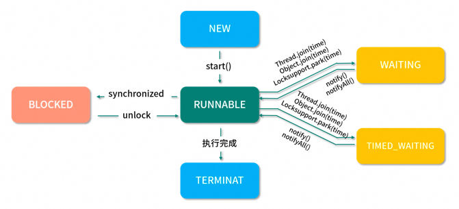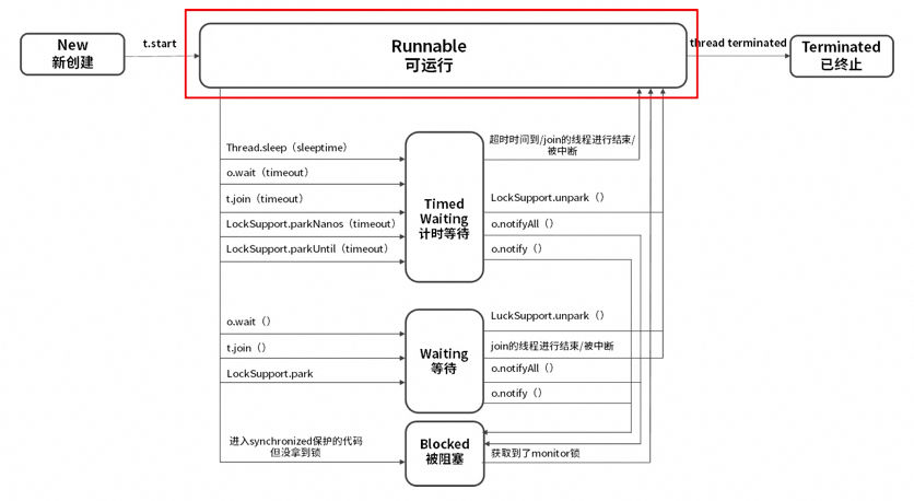 当线程 A 处于 WAITING、TIMED_WAITING 状态时,其他线程调用 A.interrupt() 方法,会使线程 A 转到 RUNNABLE 状态,同时线程 A 的代码会触发 InterruptedException 异常。