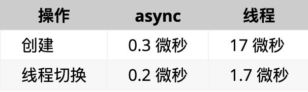 事实上, async 底层也是基于线程实现,但是它基于线程封装了一个运行时,可以将多个任务映射到少量线程上,然后将线程切换变成了任务切换,后者仅仅是内存中的访问,因此要高效的多。