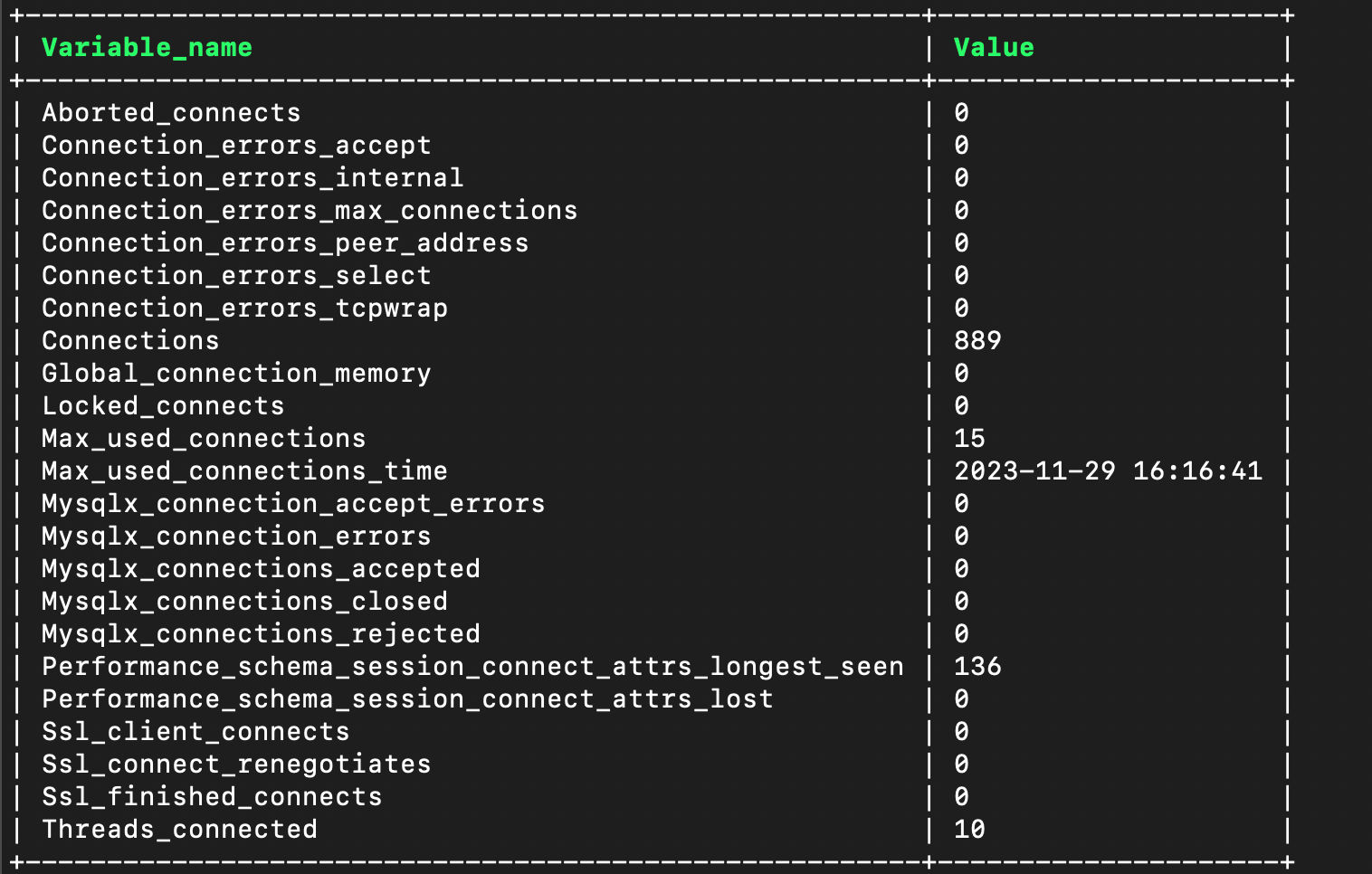 connection_status;+-------------+-----------------+-------------------+-------------+
