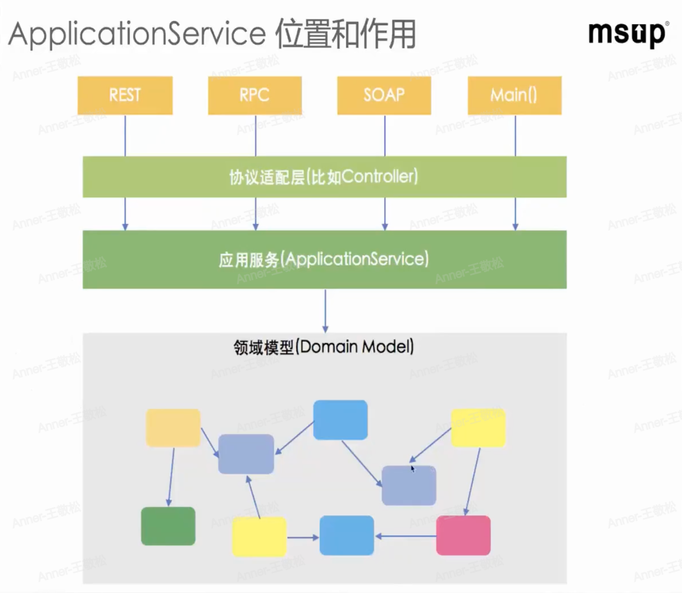 应用服务是用来表达 use case 的 本身不具备业务逻辑 , 只负责编排协调领域服务来实现实现用例。 应用服务可以存在分支 , 但是分支里面的逻辑是比较少。