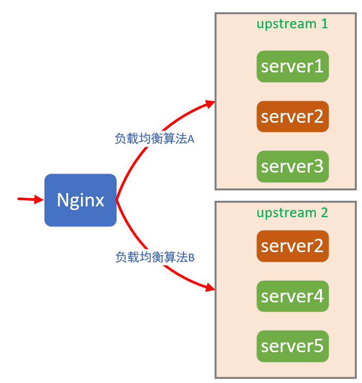 在 Nginx 中,上游服务可以通过 server 指令声明其 IP 地址或者域名,并通过 upstream 块指令定义为一组。这一组 server 中,将使用同一种负载均衡算法,从请求信息(比如 HTTP Header 或者 IP Header)或者上游服务状态(比如 TCP 并发连接数)中计算出请求的路由