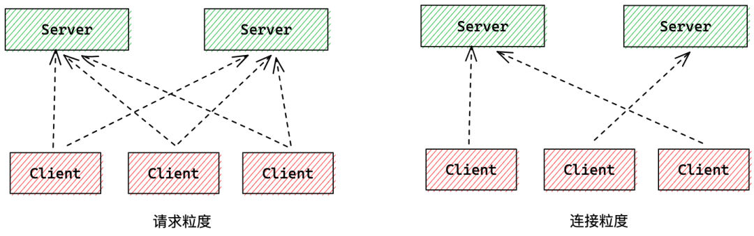 请求粒度负载均衡的实现方式是一个客户端与每个服务端都建立连接,发送请求时按照某种负载均衡策略选择一个服务端进行请求;连接粒度的负载均衡则是客户端在建立连接时按照某种负载均衡策略挑选一个节点进行建连,后续请求都发往这个节点
