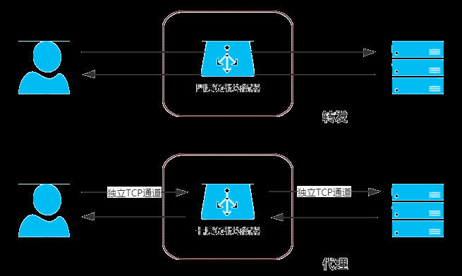 但工作在四层之后的负载均衡模式就无法再进行转发了,只能进行代理,此时真实服务器、负载均衡器、客户端三者之间由两条独立的 TCP 通道来维持通信,转发与代理的区别如图: