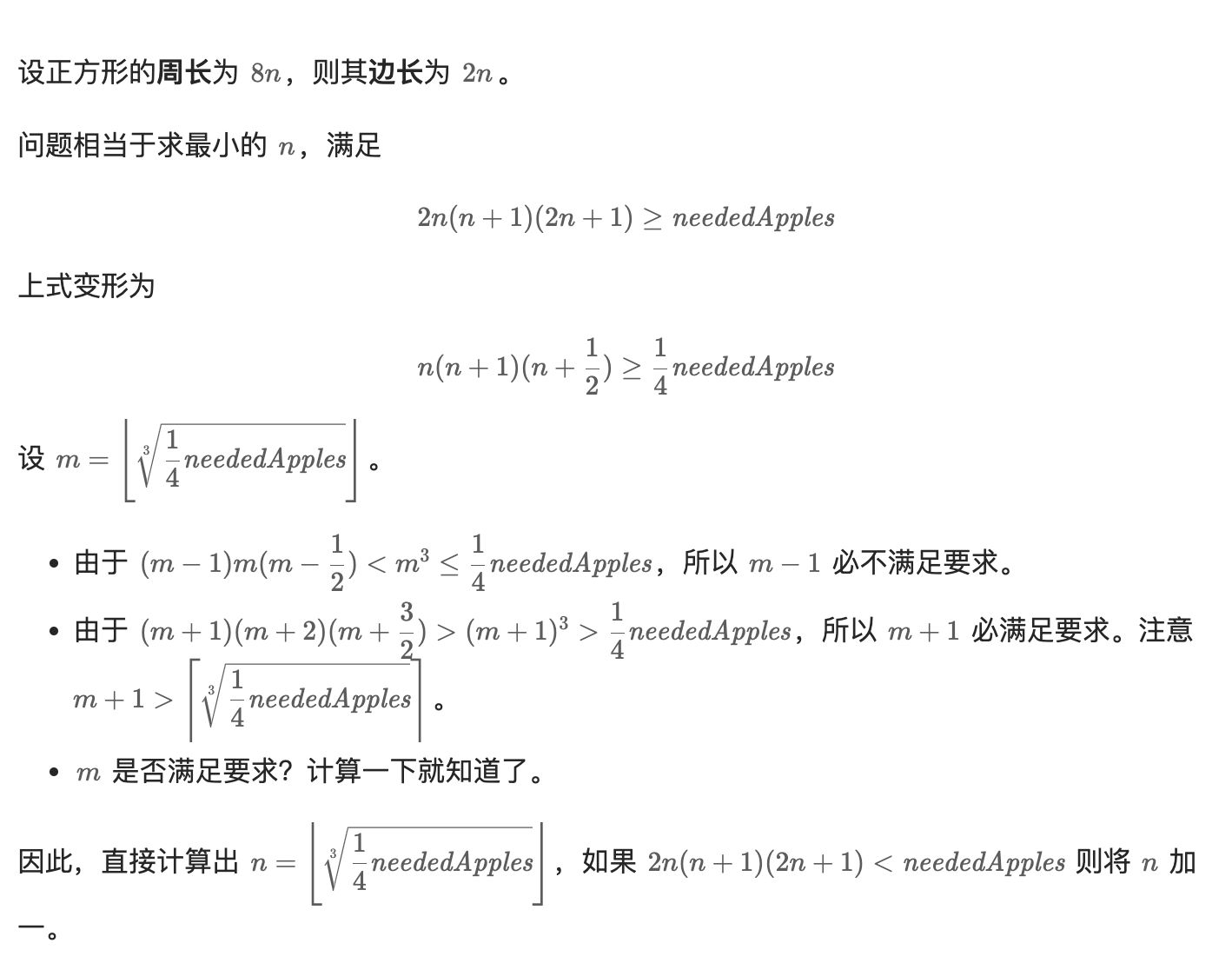 给你一个整数 neededApples ,请你返回土地的 最小周长 ,使得 至少 有 neededApples 个苹果在土地 里面或者边缘上。
